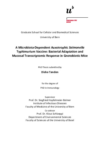 Tandon, Disha (2023). A Microbiota-Dependent Auxotrophic Salmonella Typhimurium Vaccine: Bacterial Adaptation and Mucosal Transcriptomic Response in Gnotobiotic Mice. (Thesis). Universität Bern, Bern