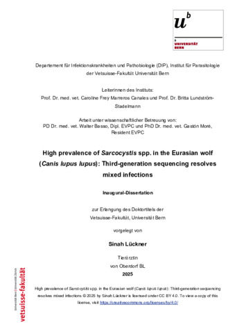 Lückner, Sinah (2025). High prevalence of Sarcocystis spp. in the Eurasian wolf (Canis lupus lupus): Third-generation sequencing resolves mixed infections. (Thesis). Universität Bern, Bern
